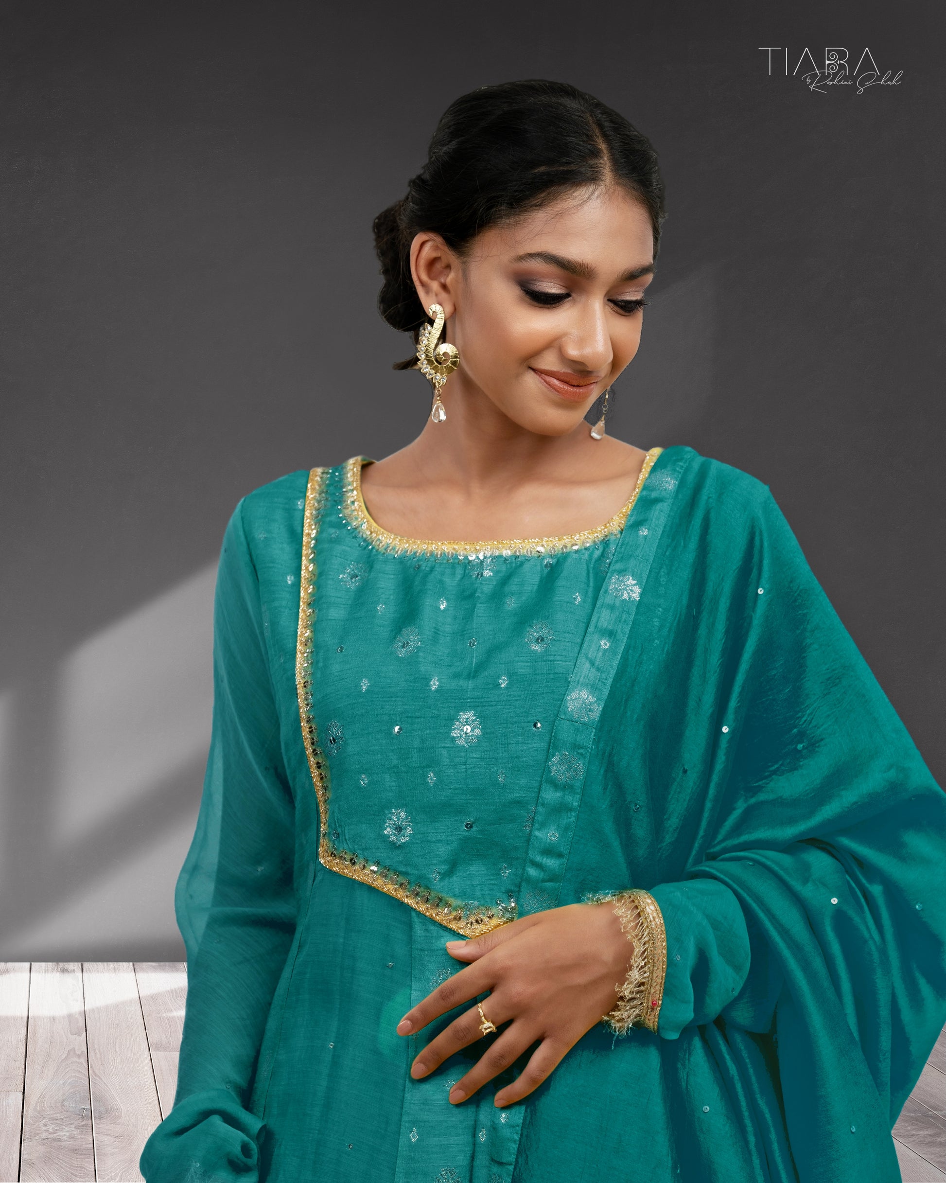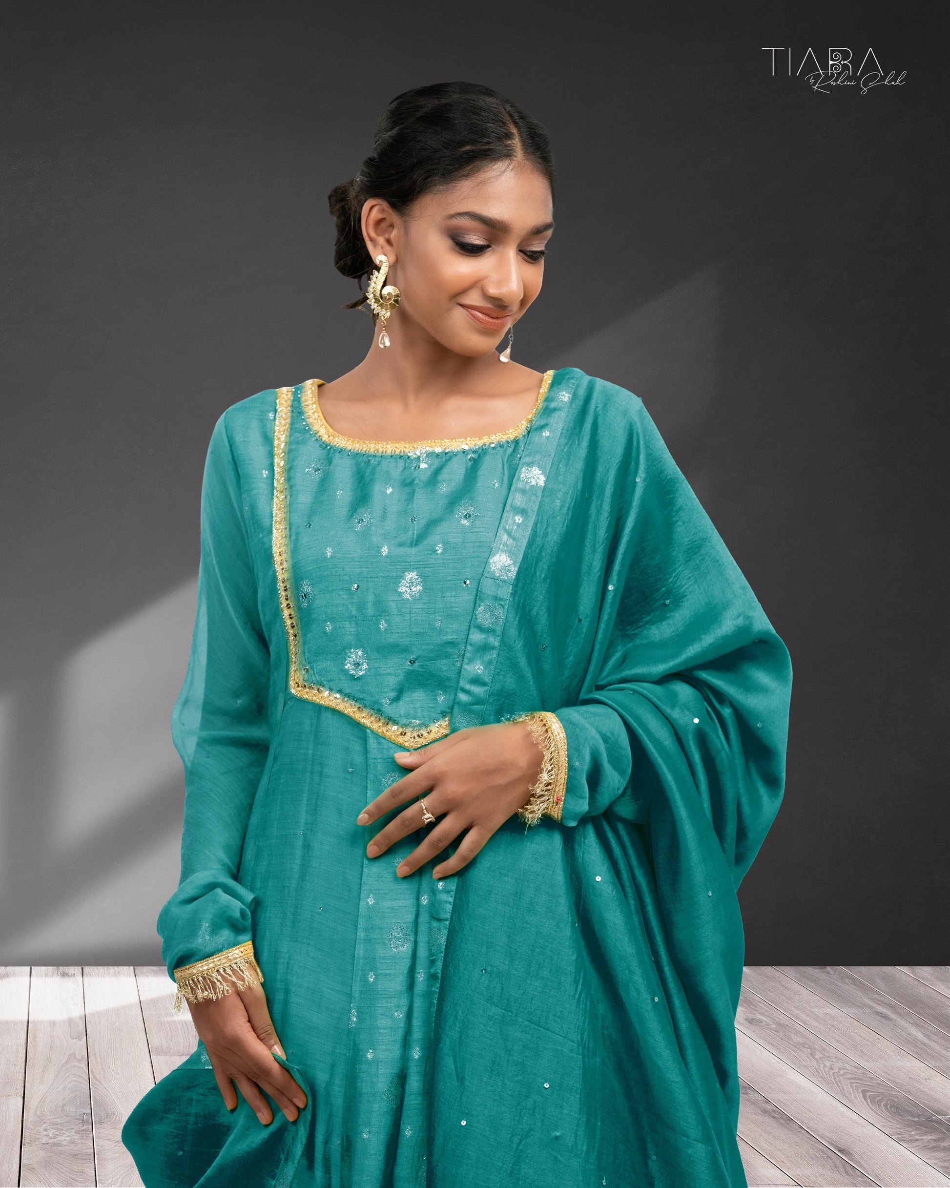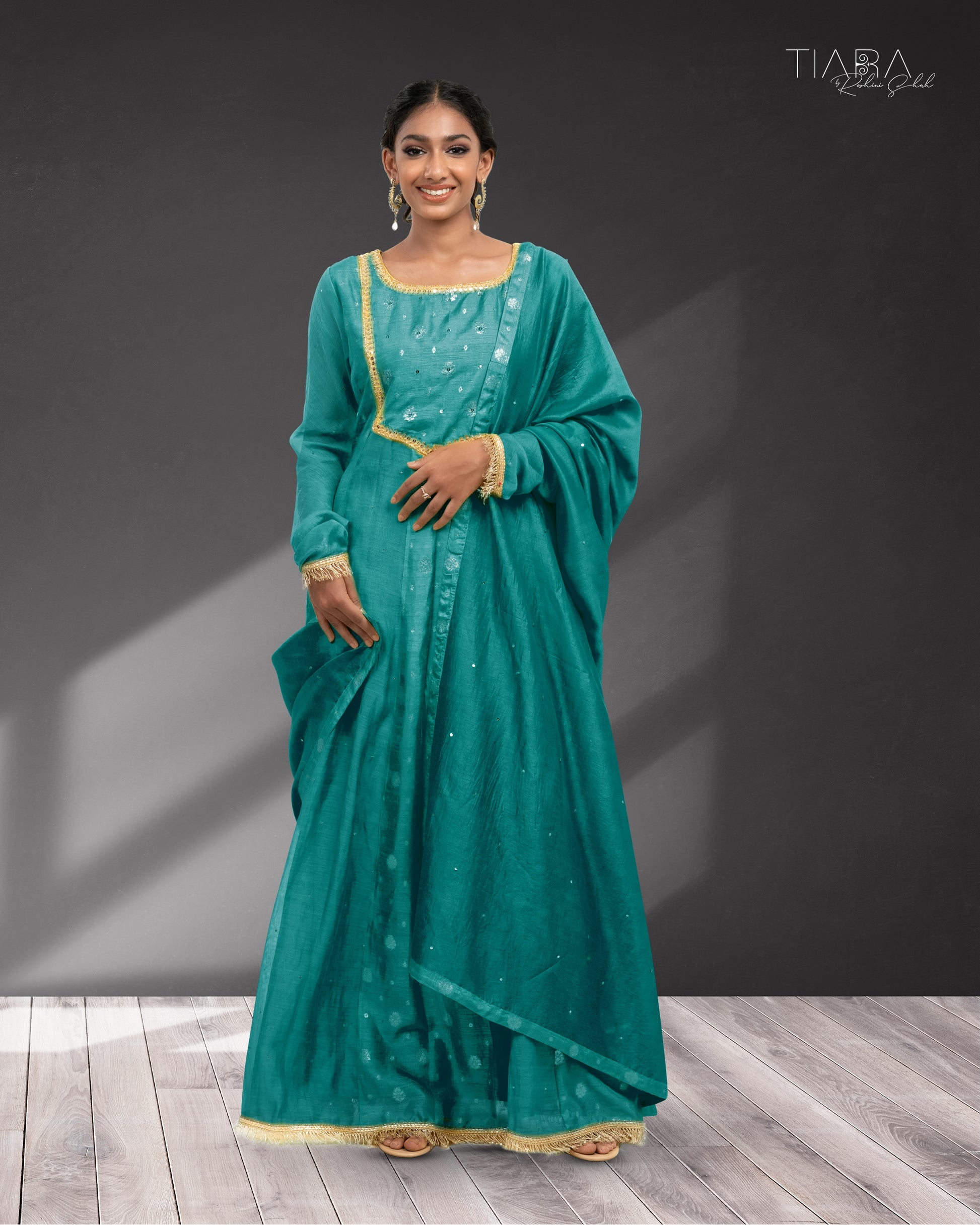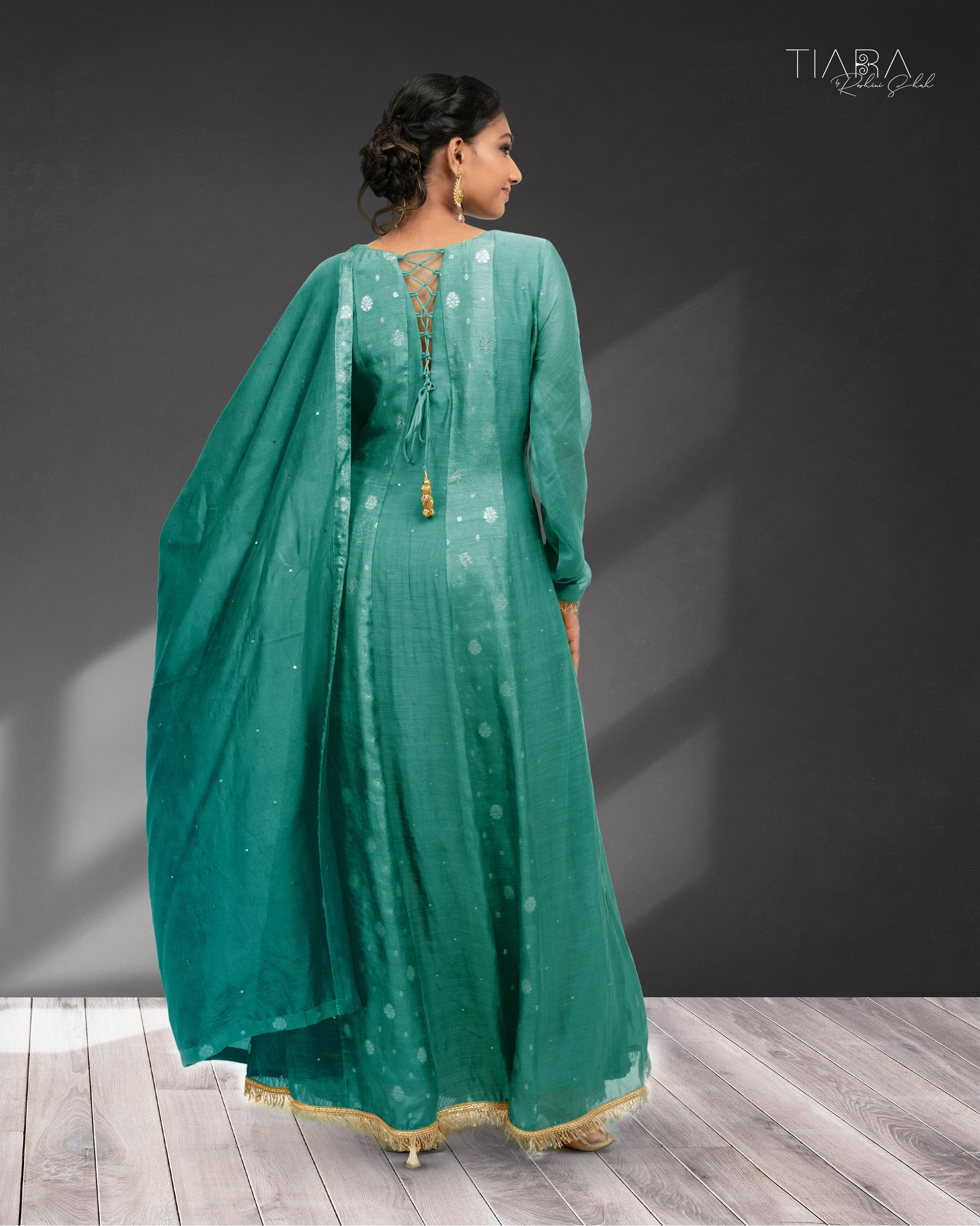 Benarsi Chanderi Anarkali Gown - Aqua Green