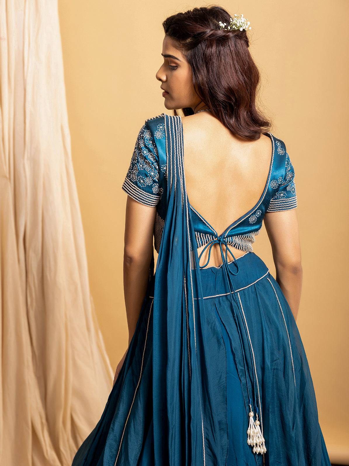 Organza Layered lehenga with a silk blouse with pearl detailing with a satin silk embroidered blouse with intricate flowers in thread and pearls , teamed with a pearl detailed dupatta