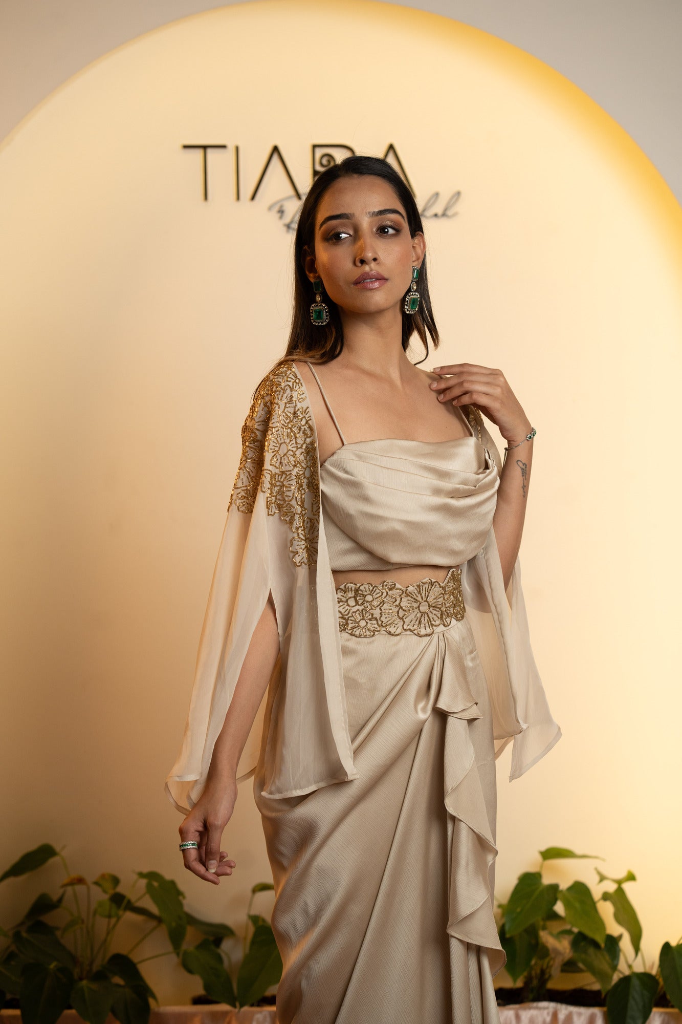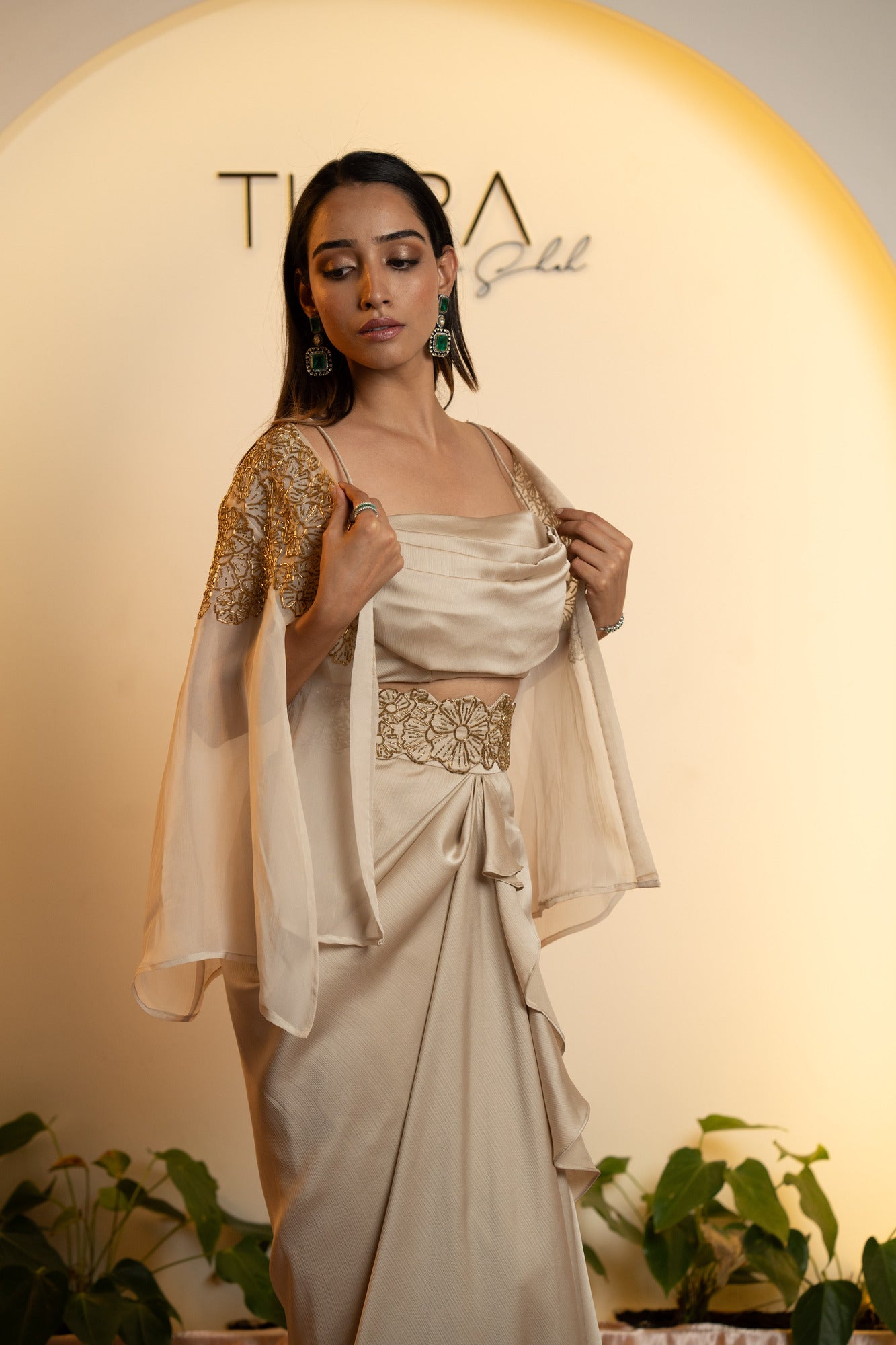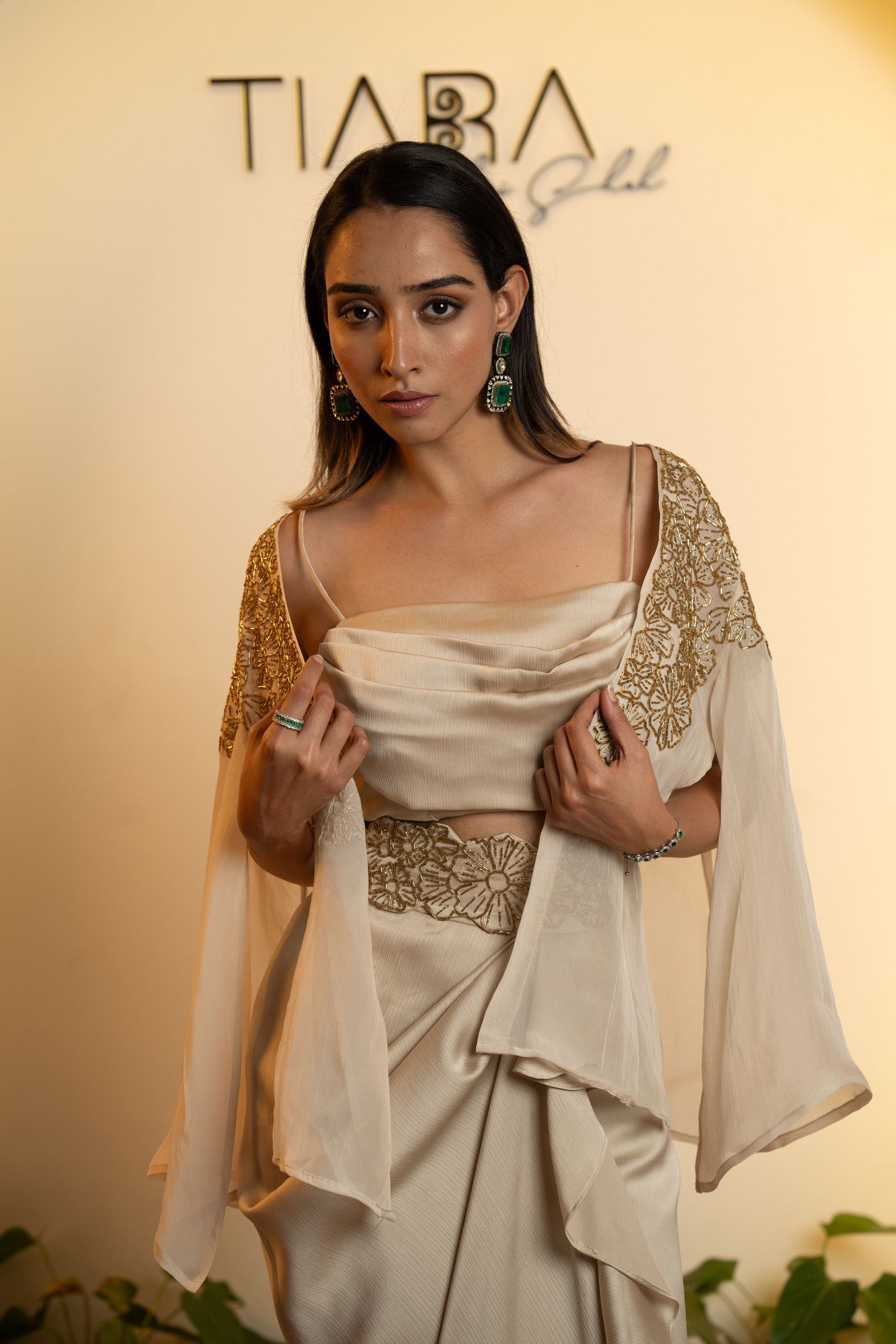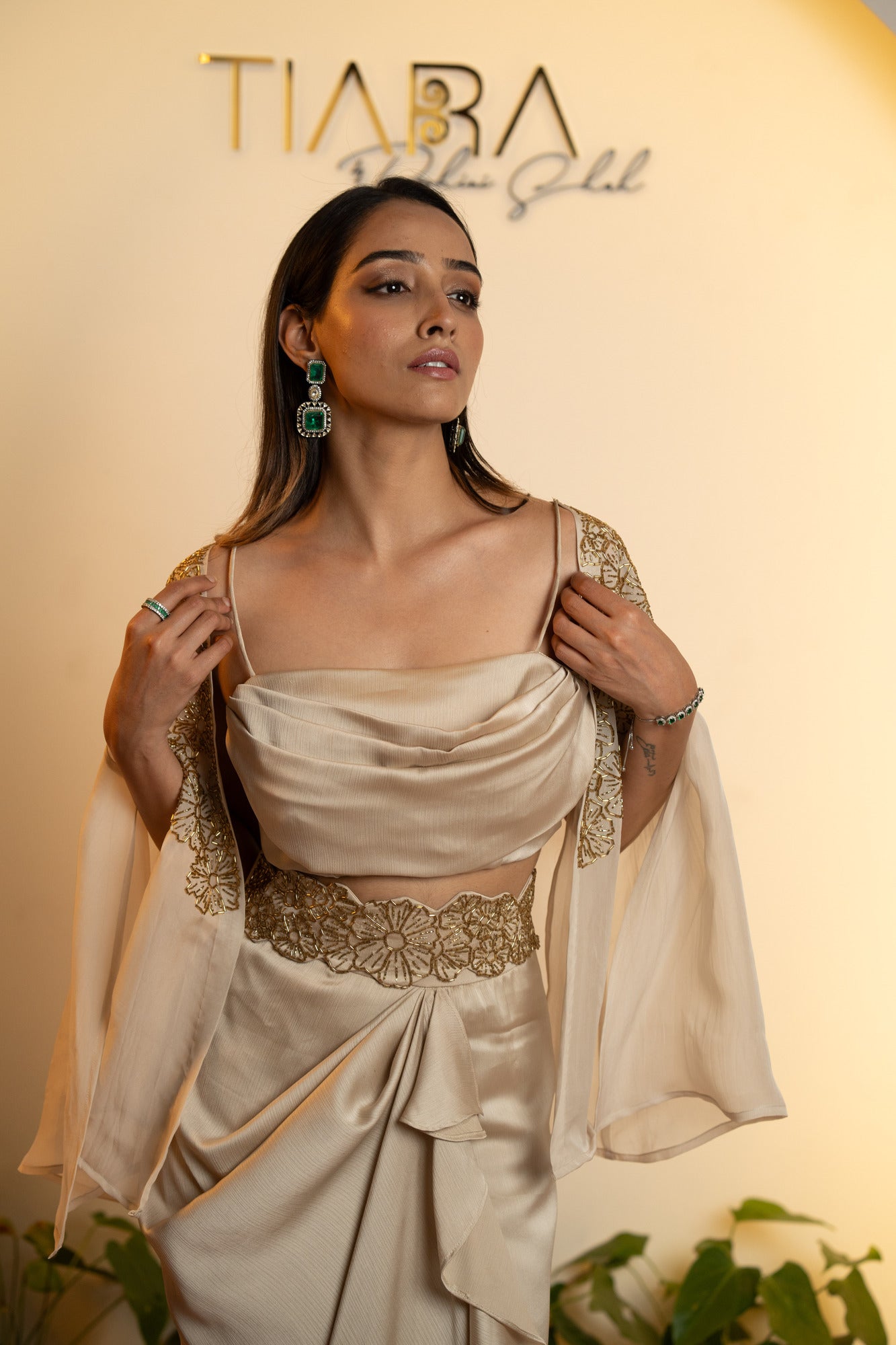 Elegant Cocktail Ensemble: Draped Skirt & Embroidered Jacket - Ivory & Gold