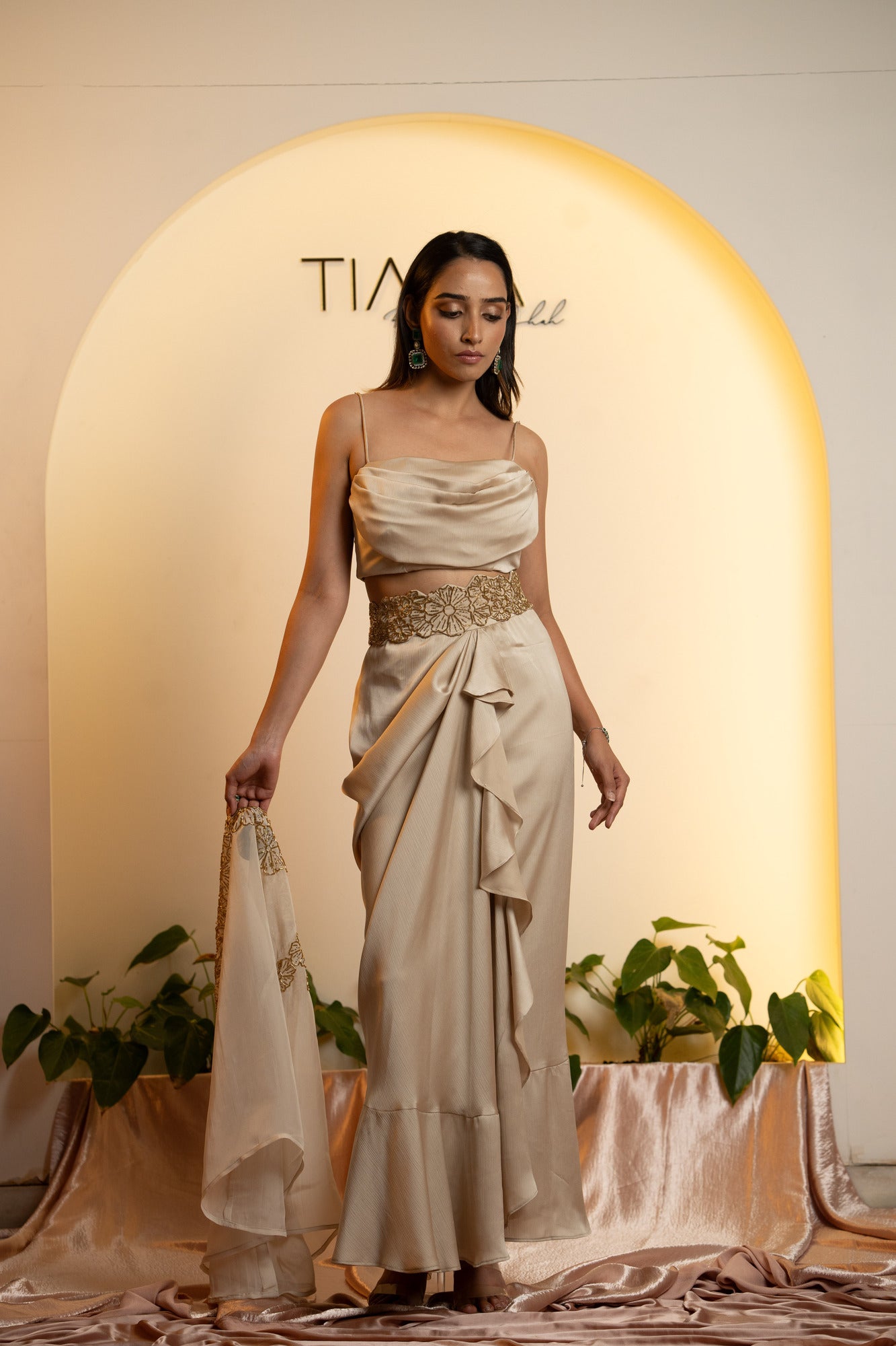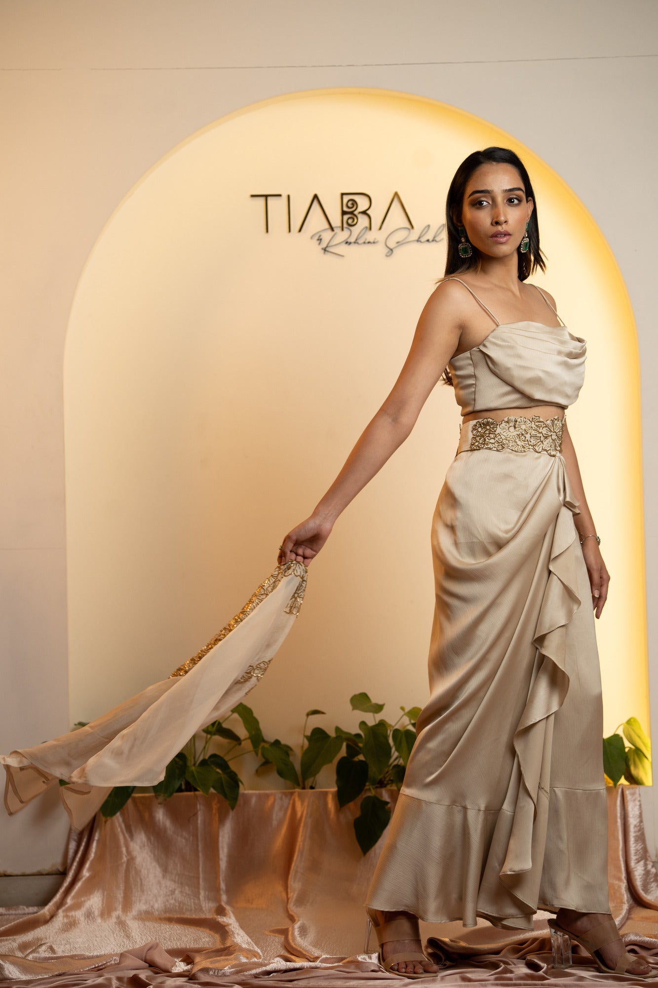 A fusion of simplicity and elegance. Elevate your evening attire with our exquisite draped skirt and matching bustier, elegantly paired with a delicately embroidered jacket and belt. Ideal for sophisticated soirées and special occasions, each piece embodies timeless charm and refined style. Discover your perfect ensemble for unforgettable evenings.