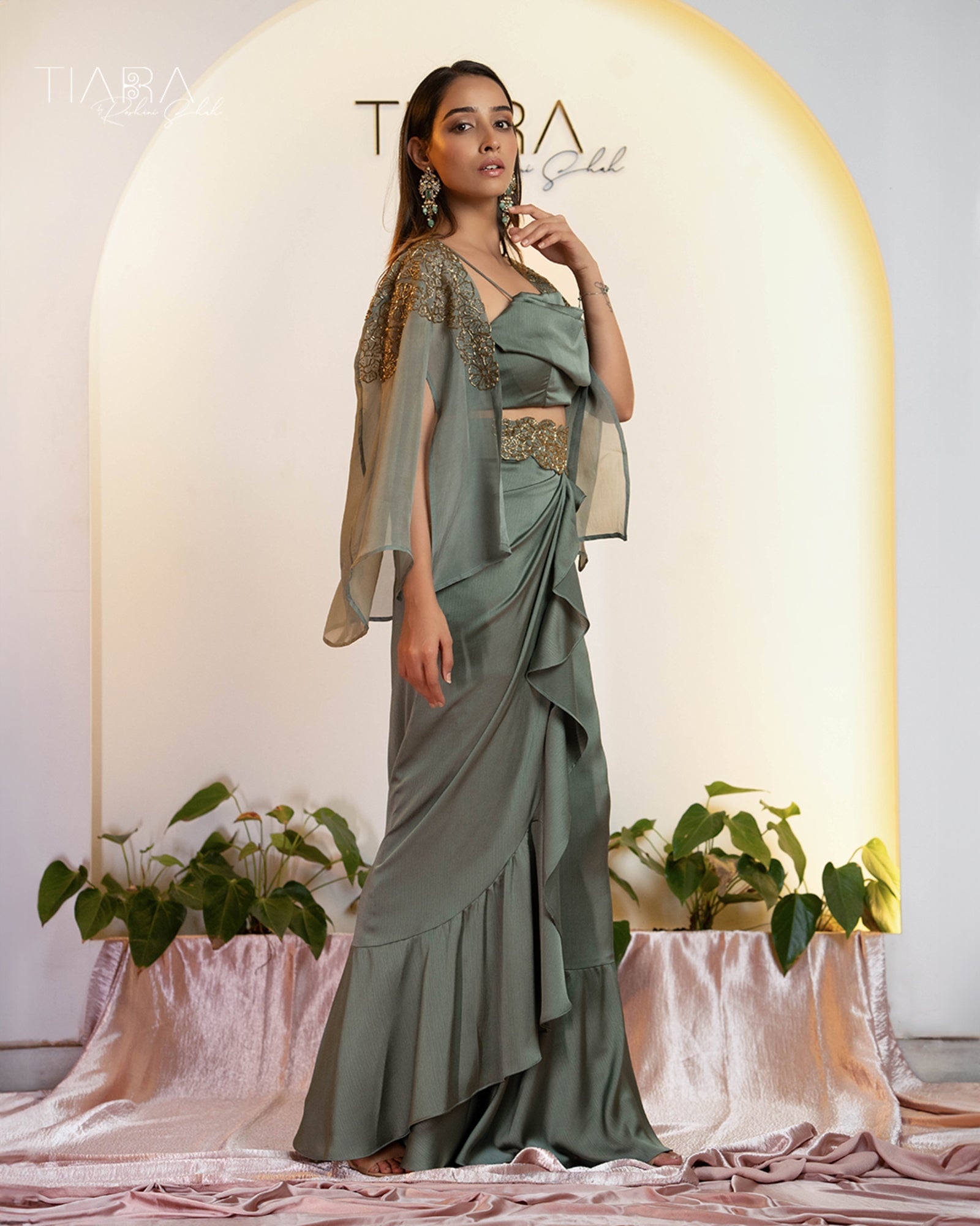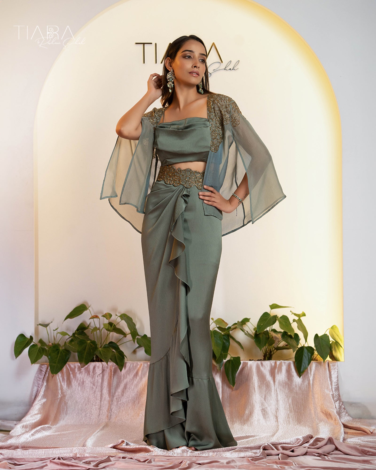 Elegant Cocktail Ensemble: Draped Skirt & Embroidered Jacket - Sage Green