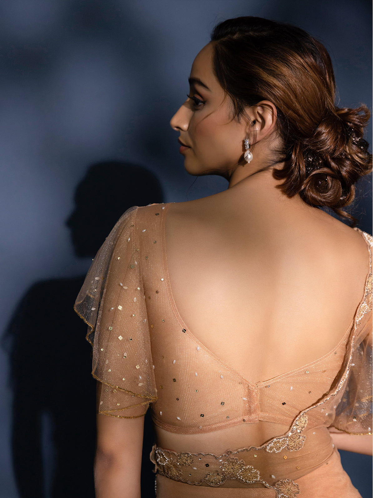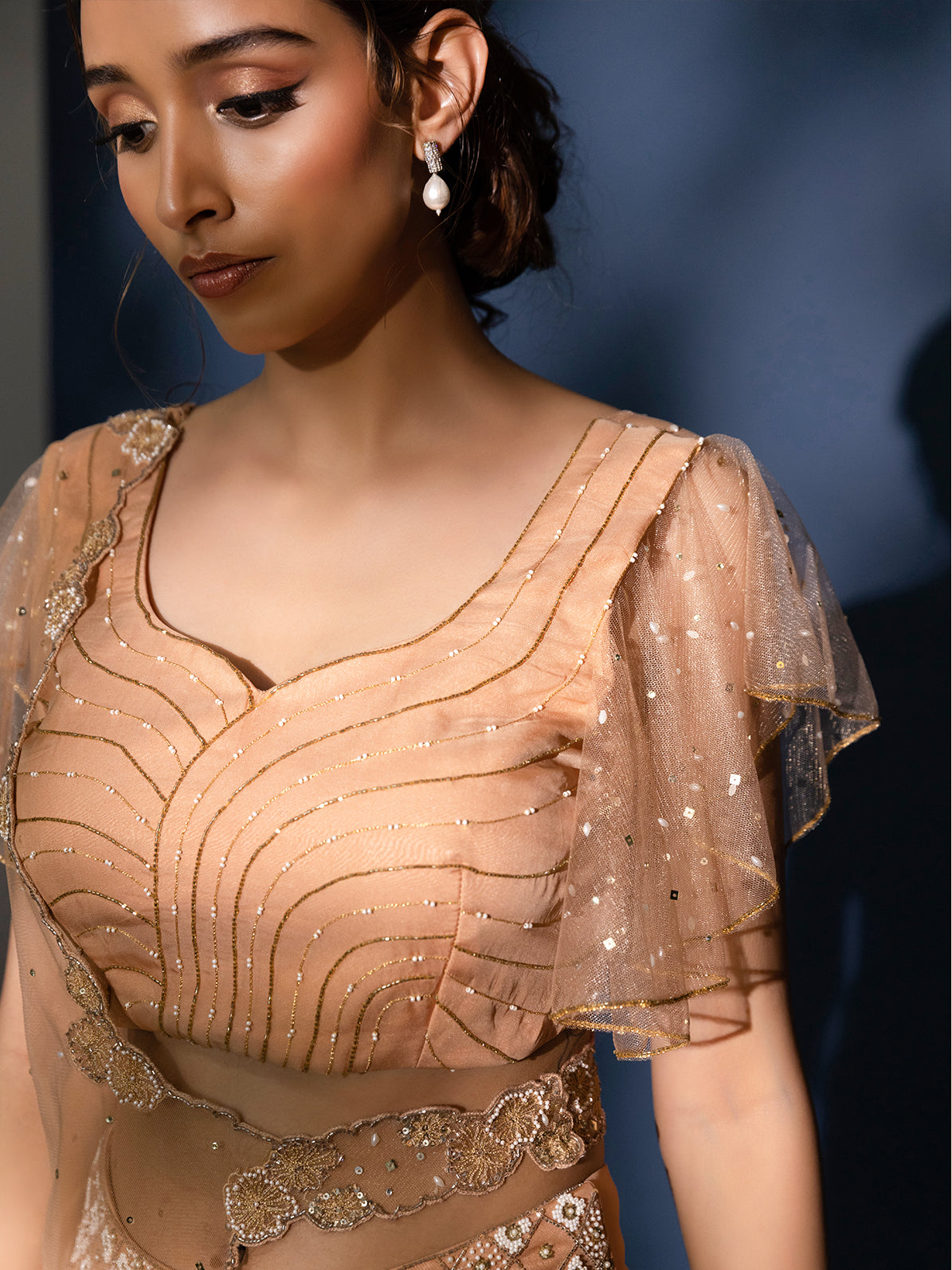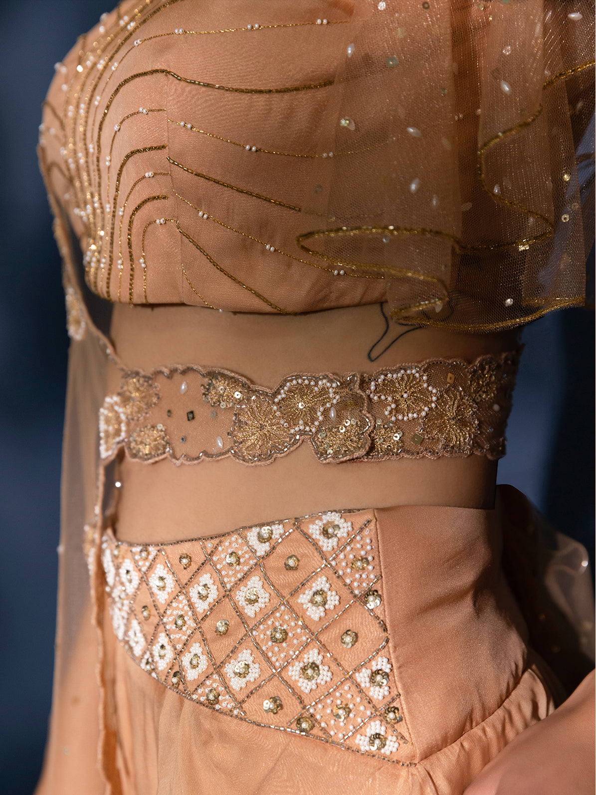 Step into refined elegance with our stunning 3-piece outfit, crafted from luxurious organza and net. This delicate ensemble is intricately embroidered with pearls and sequins, adding a touch of sparkle and sophistication. The highlight of the outfit is the unique single-shoulder drape jacket, which enhances its modern silhouette and adds a dramatic flair, making it perfect for those who seek a bold yet graceful statement piece.