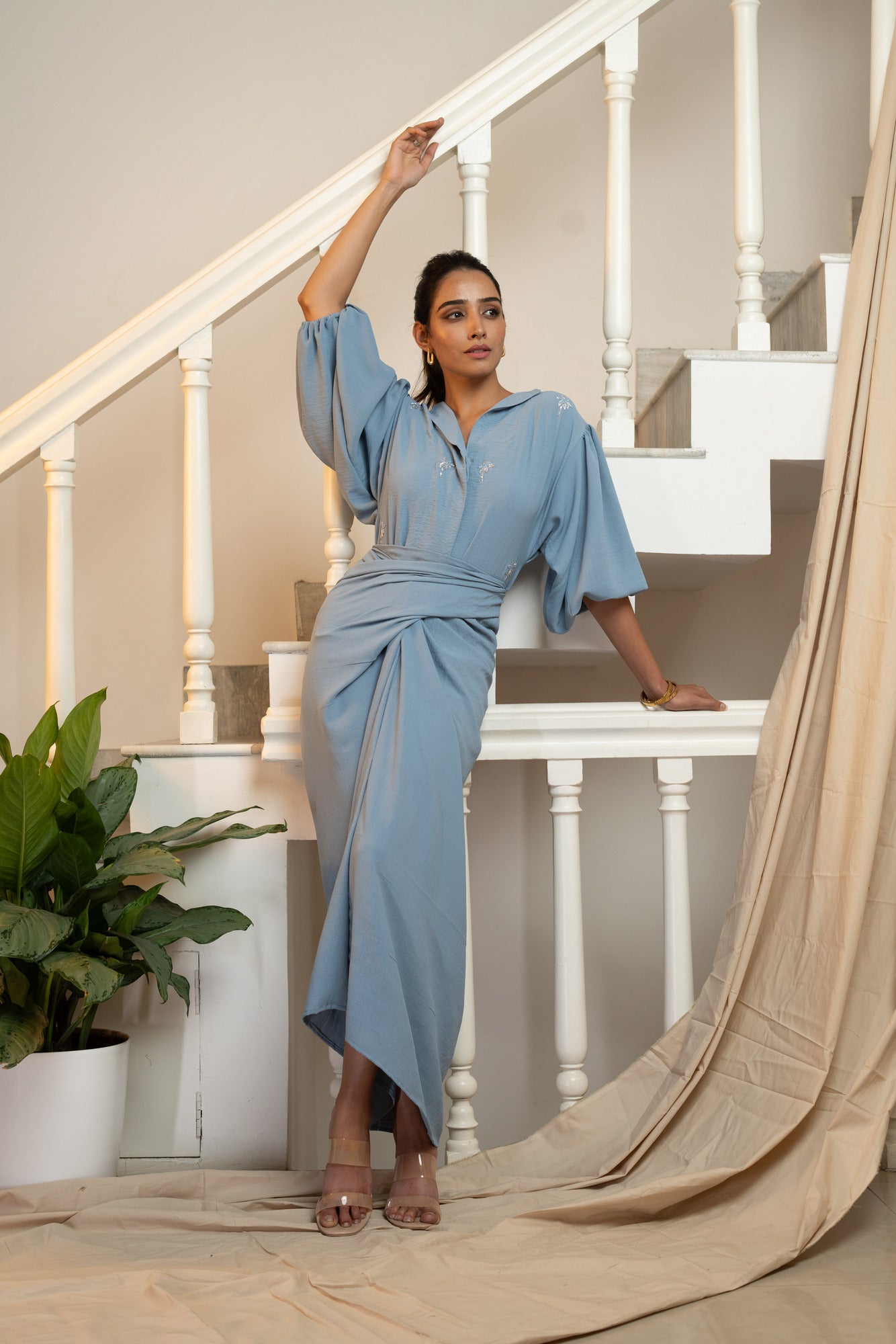 This exquisite drape dress,adorned with hand embroidered palm tree motifs,brings together the perfect blend of style and comfort for sunny days and balmy nights .