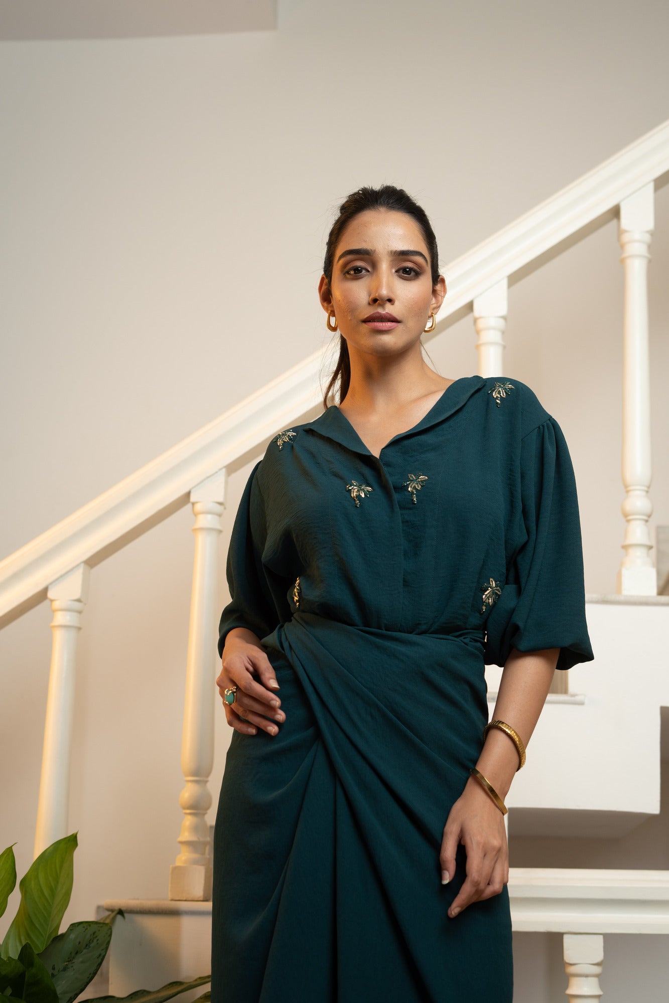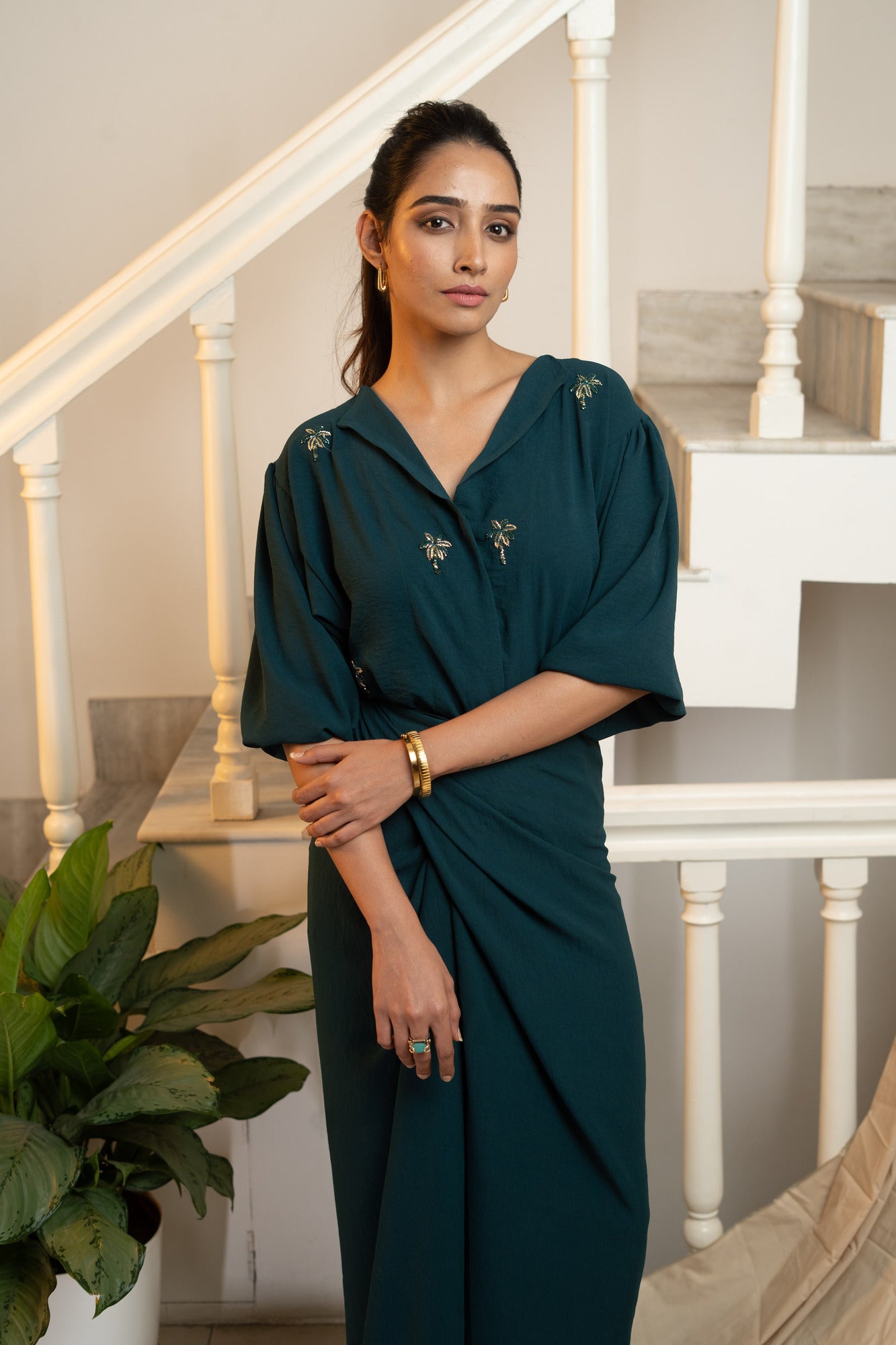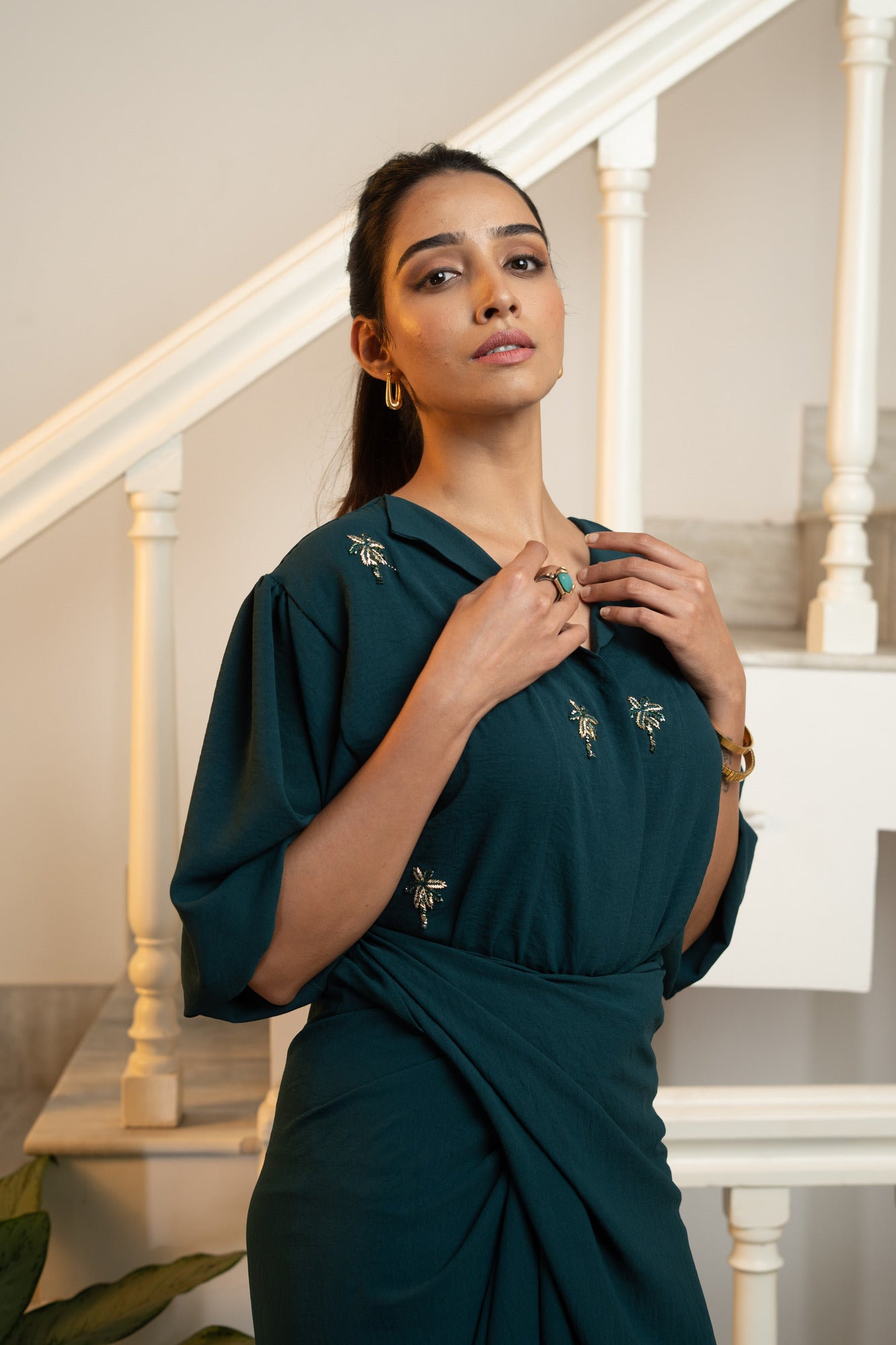 This exquisite drape dress, adorned with hand embroidered palm tree motifs, brings together the perfect blend of style and comfort for sunny days and balmy nights .