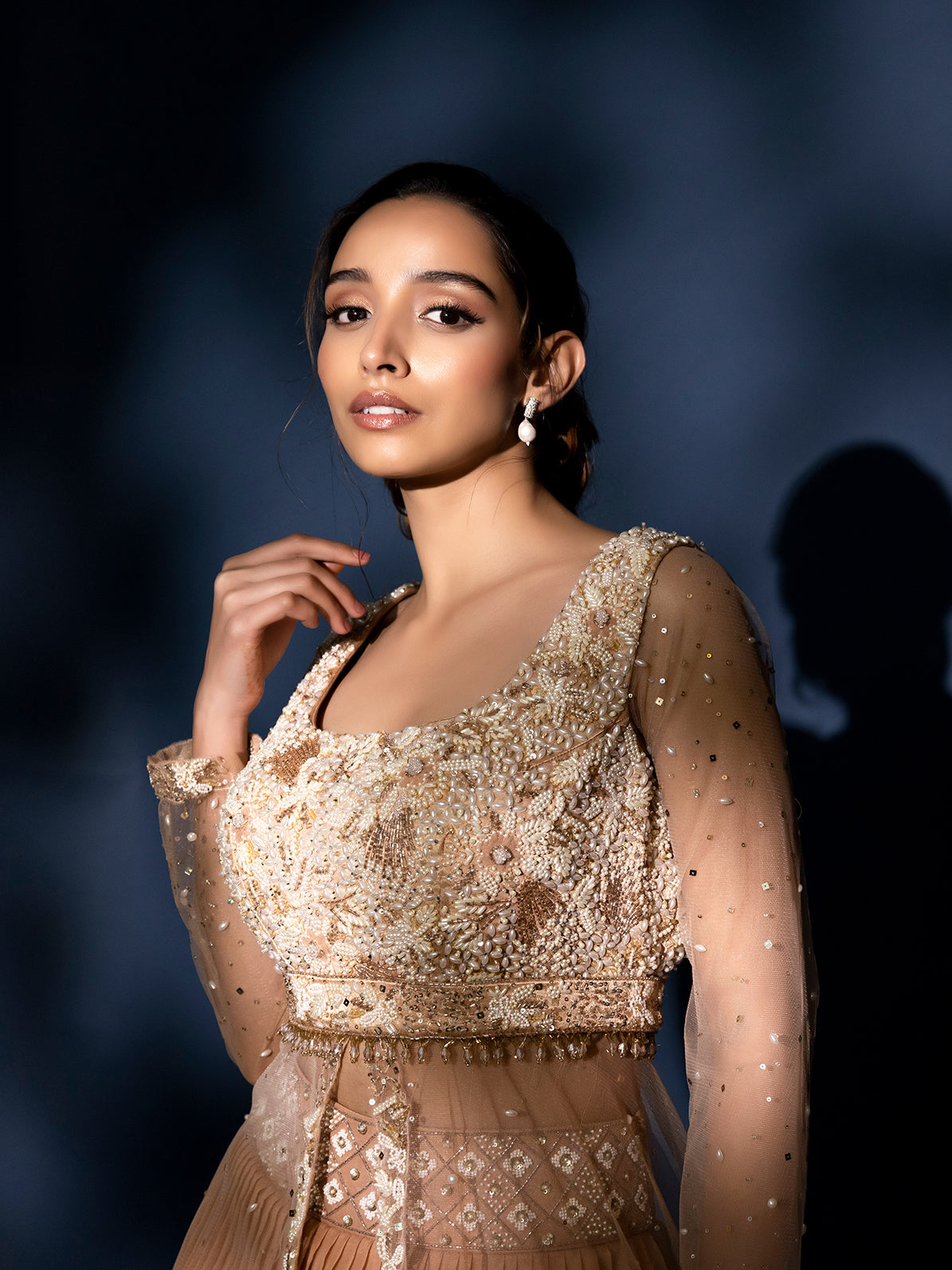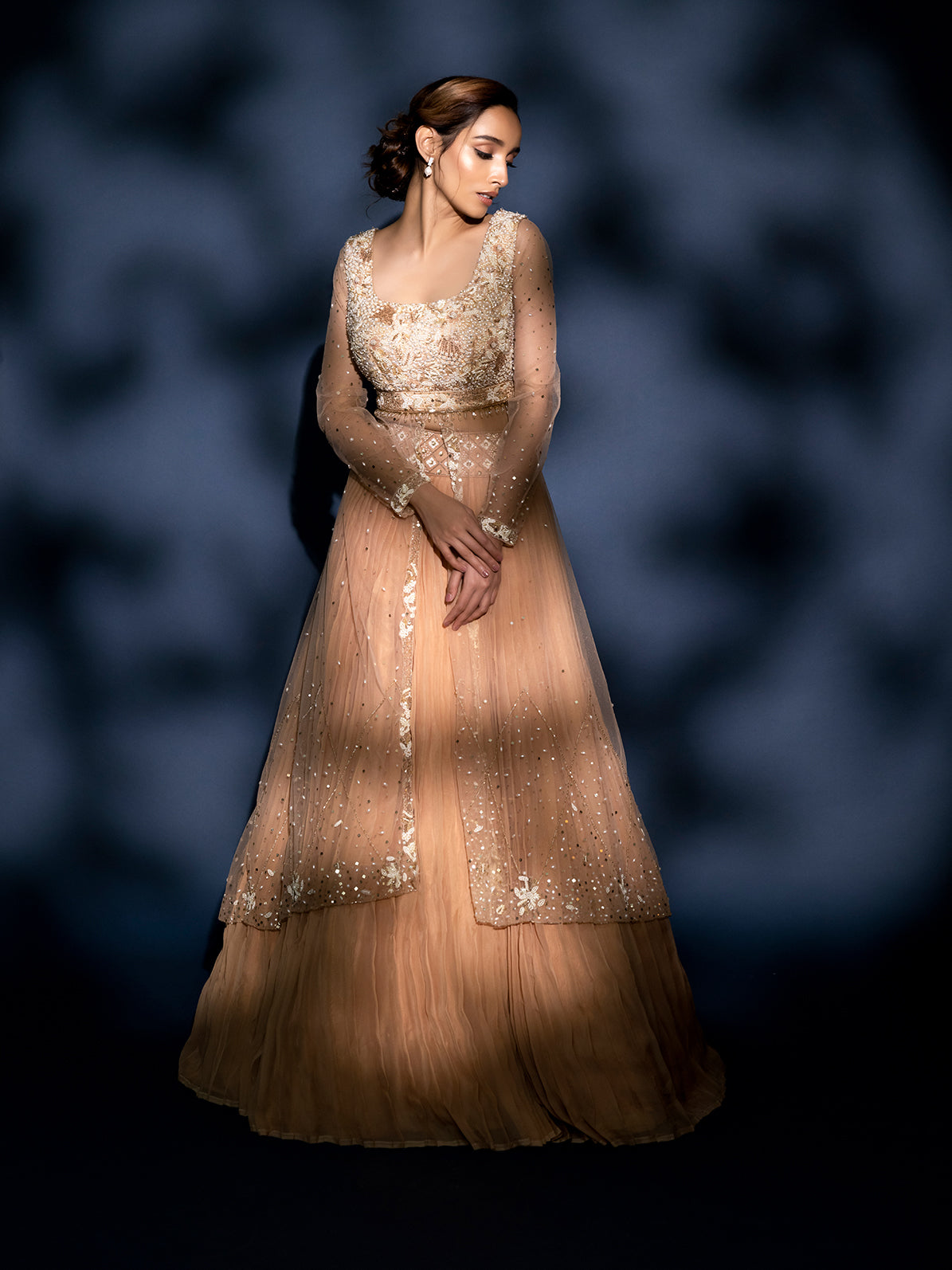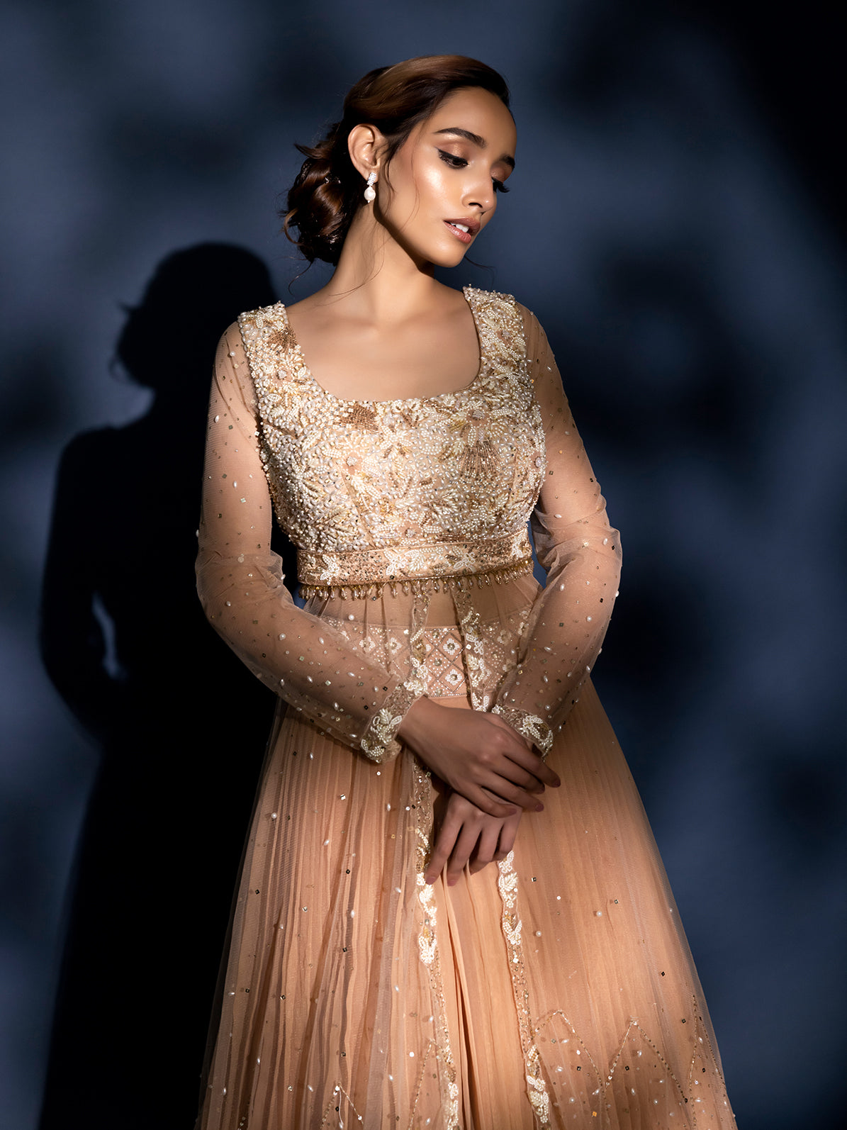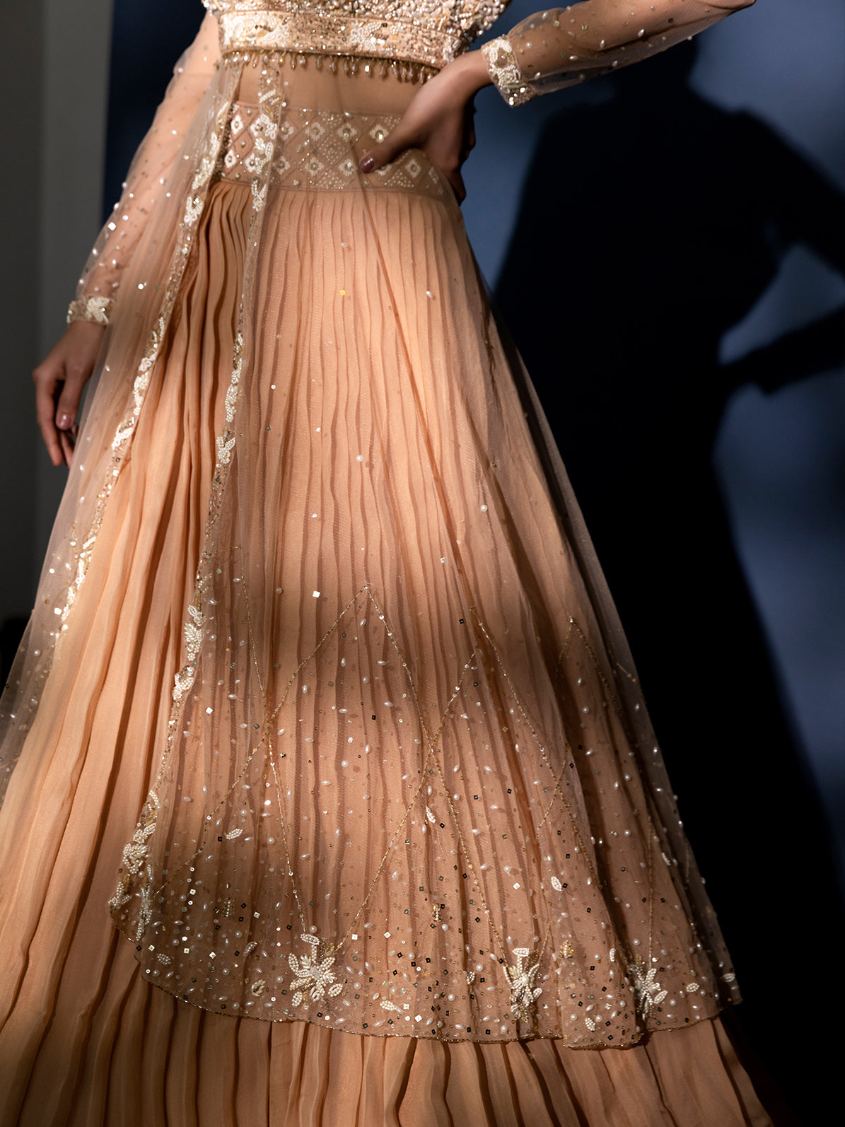 This rose gold cocktail outfit is the perfect blend of luxury and grace. The pleated organza lehenga pairs beautifully with a silk and net tunic, creating a refined yet modern silhouette. Adorned with delicate pearl, stone, and sequin embroidery, this ensemble shimmers with intricate detailing. Ideal for any special occasion, it offers a timeless elegance with a touch of sparkle, ensuring you stand out effortlessly.