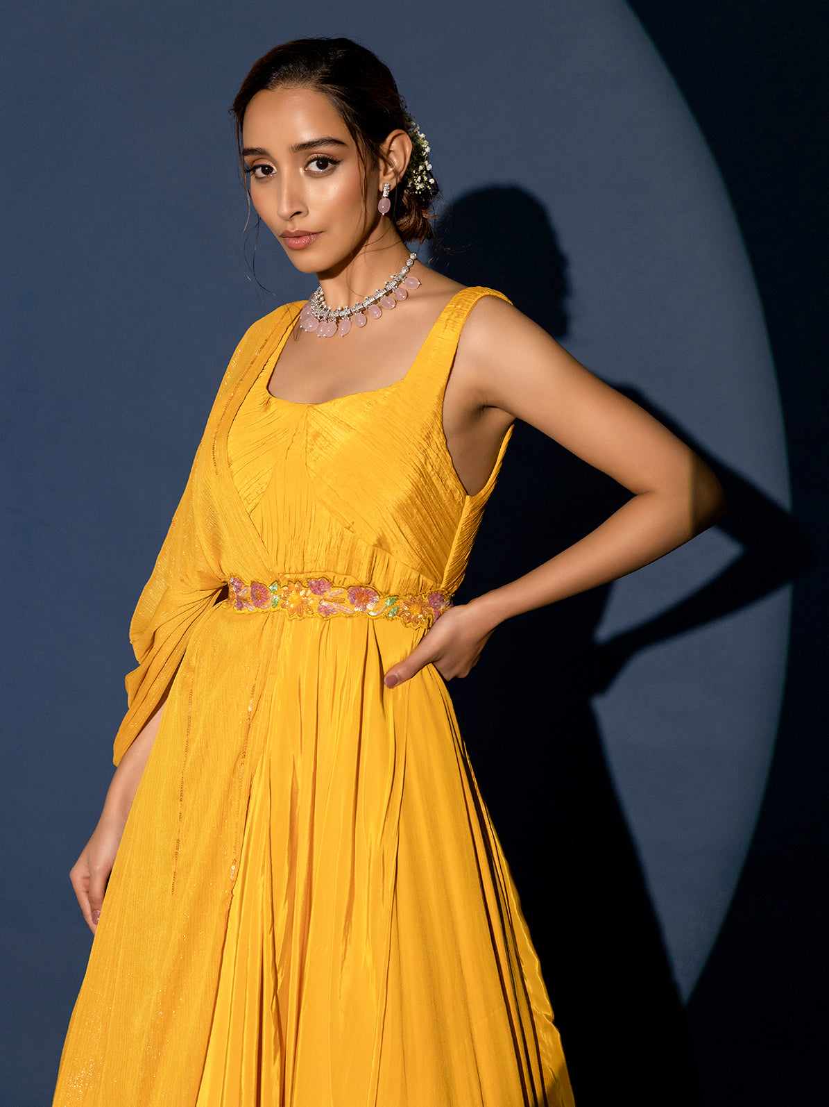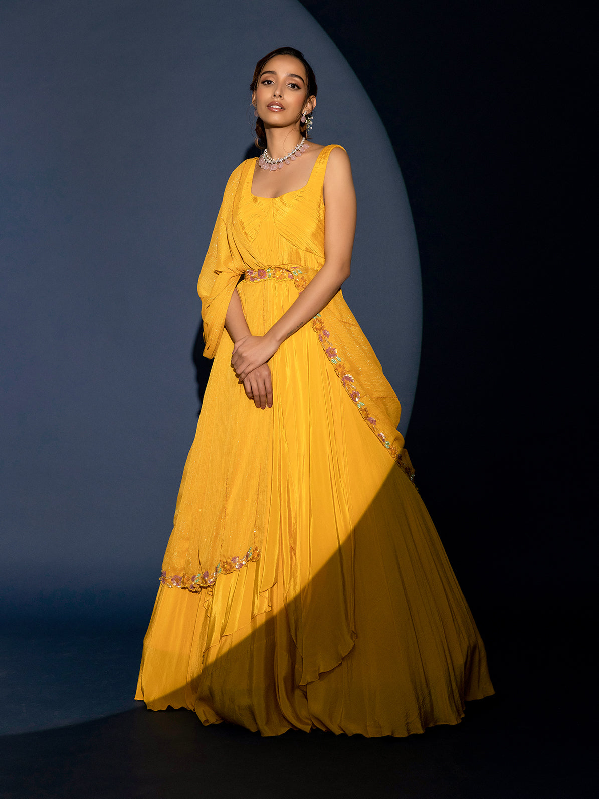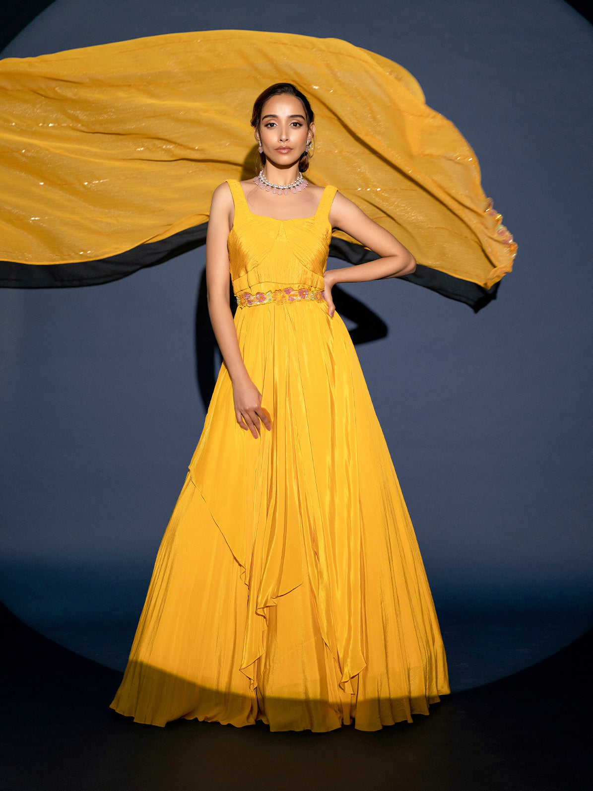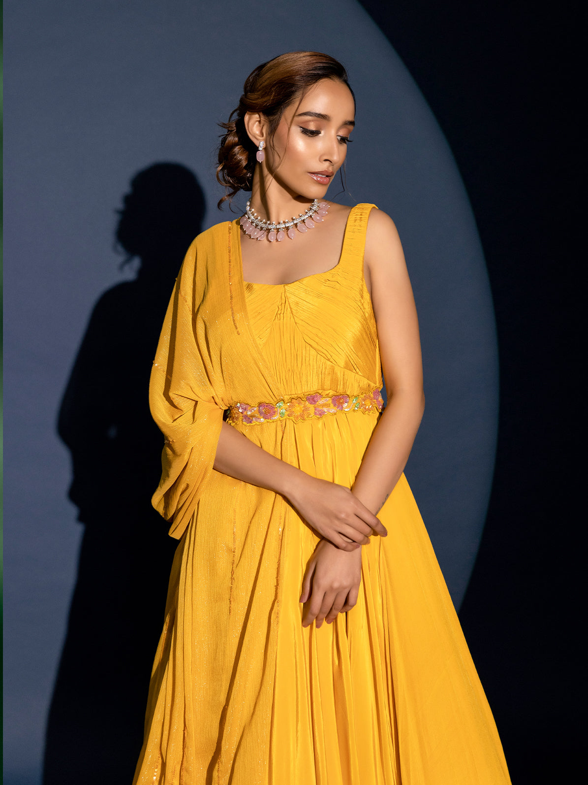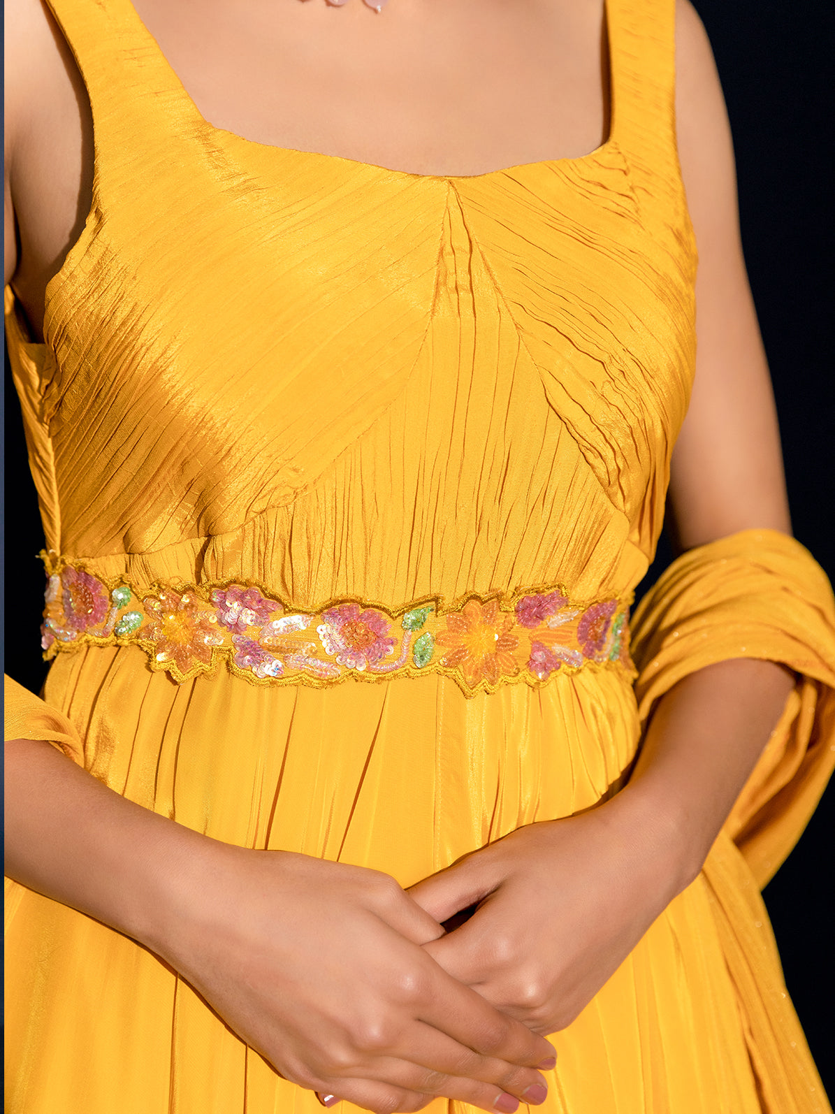 Experience elegance with our exquisite layered gown, designed to make a statement. Paired with a shimmering metallic georgette dupatta and a beautifully embroidered belt, this ensemble is adorned with delicate floral motifs and vibrant sequins. The intricately detailed yoke with soft gathers on the bust adds a refined touch, making this outfit a perfect blend of sophistication and charm for any special occasion.